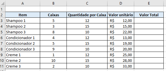 Ainda utilizando o exemplo dos produtos, vamos supor que você tenha a informação de quantas caixas de cada produto estão no estoque, a quantidade de produtos por caixa e o valor unitário dos produtos. Você precisa calcular o valor total dos produtos em estoque: