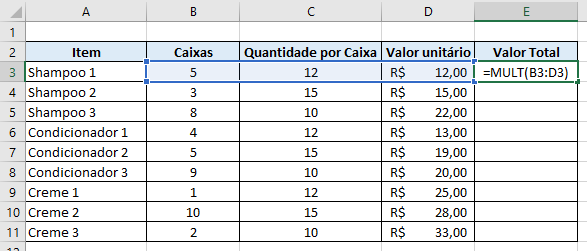 Nesse caso, a fórmula para o valor total do Shampoo 1 seria =MULT(B5:D5), lembrando que o intervalo a ser multiplicado deve ficar entre parênteses e separado por dois pontos. Dessa forma, você está dizendo ao Excel que ele deve fazer a multiplicação de todos os valores que ficam entre as células B5 e D5.