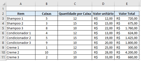 Vamos supor que, na planilha abaixo, todos os produtos foram vendidos em caixas de 5 unidades. Você precisa multiplicar todos os valores unitários por 5: