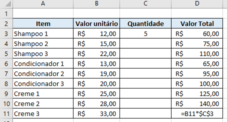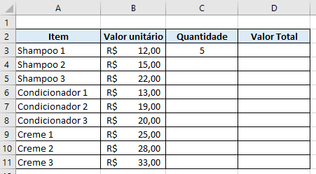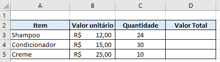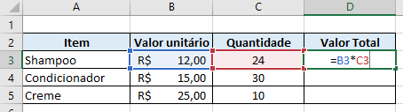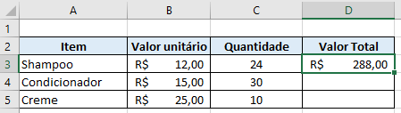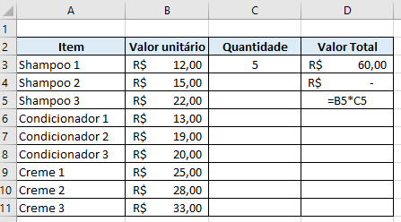 Aqui, queremos saber o valor total a ser pago por cada item, multiplicando seu valor unitário pela quantidade comprada. A fórmula para saber o valor total do Shampoo seria =B3*C3: