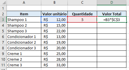 Nesse caso, o símbolo $ trava a célula na fórmula, impedindo que o Excel a substitua. A fórmula, então, ficaria assim: =B3*$C$3